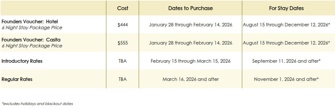 Purchase a Founders Voucher Now for the Founder's Discount:A 6 Night stay for just $444 for a Limited Time